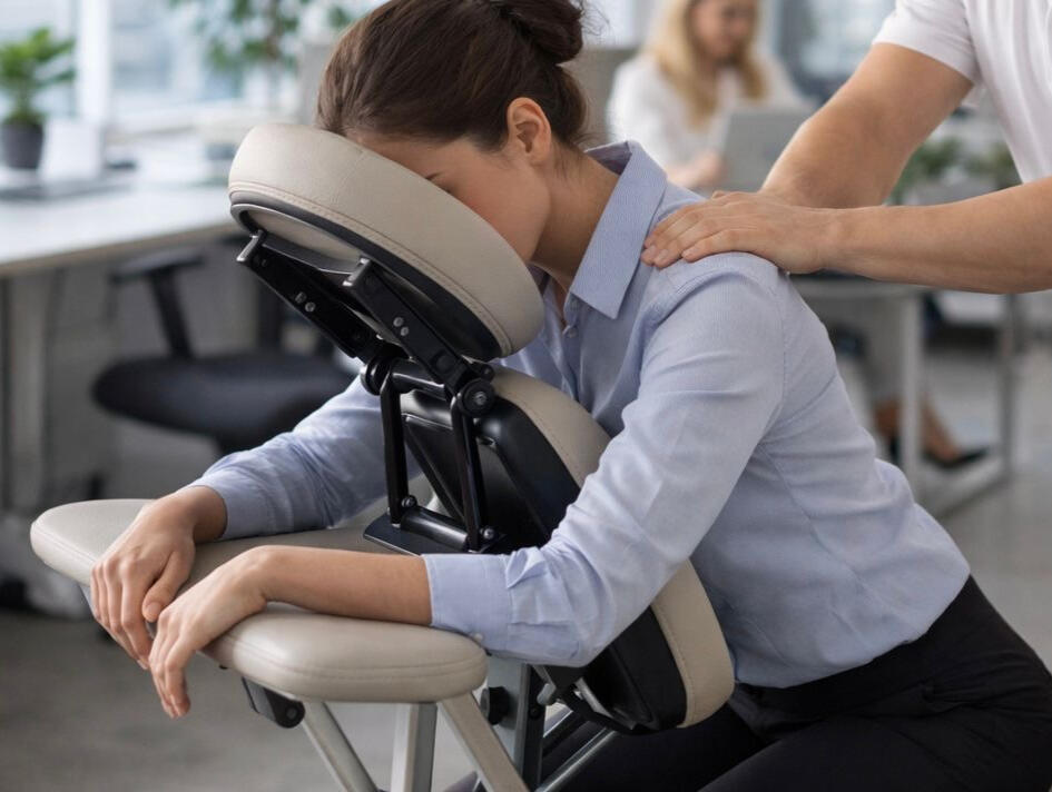 On-site chair massage focused on shoulders and upper back — a simple, effective way to reduce stress and support employee wellbeing.